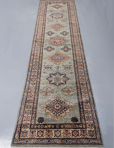 This Afghan Kazak Runner Rug, measuring 299 x 80cm, is a beautifully handmade piece crafted from hand-spun wool and dyed using natural, rich colours. The rug features a classic geometric design with star-shaped medallions and intricate borders, making it a timeless addition to any space. The colour palette includes earthy tones of beige, soft blues, and warm reds, which are highlighted by the skilful use of natural dyes. Its long and narrow shape makes it ideal for hallways or corridors, adding a touch of elegance and heritage to your home decor. Durable and eye-catching, this rug blends traditional Afghan craftsmanship with modern appeal.