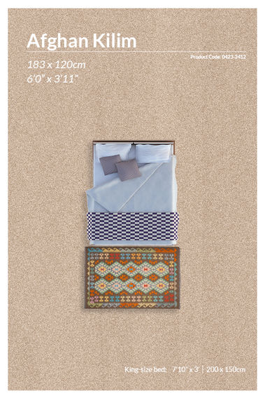 This Afghan Kilim Rug, measuring 183 x 120 cm, is a captivating flat-woven piece crafted from hand-spun wool and naturally dyed. Its design features a series of geometric diamond motifs in a delightful array of earthy tones accented by vibrant teal, mustard, and red pops. The colourful border complements the central design, creating a balanced and harmonious look. Lightweight yet durable, this rug is perfect for adding texture and warmth to any space. Its handmade nature and use of natural dyes reflect a commitment to quality and sustainability, making it a distinctive choice for those who value traditional craftsmanship.Kilim rugs have a long history, with origins tracing back centuries across regions from the Balkans to Iran and Central Asia. In Afghanistan, kilim weaving is an integral part of tribal culture. Unlike pile rugs, kilims are flat-woven without knots, resulting in a lightweight yet durable fabric. These rugs were traditionally used as floor coverings, wall hangings, and even storage sacks in nomadic communities. The bright colours and patterns often hold symbolic meanings, telling stories of family heritage, beliefs, and the natural landscape. Afghan kilims continue this legacy, blending functional art with cultural storytelling, making them timeless additions to any home.