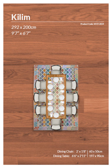 This Afghan Kilim Rug, measuring 292 x 200 cm, is a masterpiece of traditional craftsmanship. It boasts a vibrant colour palette and meticulous design, making it a striking addition to any space. This hand-made rug is crafted from hand-spun wool and dyed using natural pigments, ensuring a rich and enduring vibrancy that is both eco-friendly and authentic to its cultural heritage. The central design features a dazzling array of diamond-shaped motifs intricately woven in an overlapping grid pattern. These diamonds are filled with smaller geometric shapes, rendered in a lively mix of bright oranges, greens, blues, purples, yellows, and reds. The careful arrangement of these colours creates a harmonious yet dynamic visual effect, giving the rug a sense of movement and vitality. The border acts as a perfect frame, featuring a series of smaller, repeating geometric shapes in coordinating colours. This border adds definition and structure, enhancing the overall impact of the design. The neutral beige background serves as an ideal contrast, allowing the bold, colourful patterns to truly shine. This rug’s symmetrical layout and vibrant tones reflect the artistry and precision of Afghan weaving traditions. Its lightweight, flat-woven texture makes it versatile for use in a variety of settings, from modern minimalist spaces to more traditional, warm interiors.Kilim rugs have a long history, with origins tracing back centuries across regions from the Balkans to Iran and Central Asia. In Afghanistan, kilim weaving is an integral part of tribal culture. Unlike pile rugs, kilims are flat-woven without knots, resulting in a lightweight yet durable fabric. These rugs were traditionally used as floor coverings, wall hangings, and even storage sacks in nomadic communities. The bright colours and patterns often hold symbolic meanings, telling stories of family heritage, beliefs, and the natural landscape. Afghan kilims continue this legacy, blending functional art with cultural storytelling, making them timeless additions to any home.