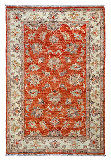 This Afghan Ziegler/Farahan Rug, measuring 147 x 99 cm, features a vibrant burnt orange field that creates a warm and inviting atmosphere. The central design consists of intricately rendered floral motifs and scrolling vines in soft beige, light grey, and muted green tones, adding elegance and harmony to the composition. The border complements the central design with a pale ivory background, showcasing similar floral and vine motifs in shades of beige, grey, orange, and green. The intricate detailing of the border frames the vibrant centre beautifully, enhancing the overall aesthetic appeal. Hand-made using hand-spun wool and naturally dyed, this rug combines traditional craftsmanship with timeless design. Its striking yet balanced colour palette and intricate detailing make it a versatile choice for a variety of interior styles, adding a touch of sophistication and warmth.The Zeigler Farahan rug design originated in the late 19th century when the British-Swiss company Ziegler & Co. began producing these rugs in the Arak region of Persia, known as Farahan. Unlike traditional Persian rugs that often had bold, complex designs, Ziegler Farahan rugs were created with more open patterns and softer colours to suit Western tastes. They became popular for their high quality and softer, subtler aesthetic, which complements a wide range of interior styles. The legacy of Zeigler Farahan rugs endures today, with Afghan artisans adapting the style to continue the tradition of these versatile and elegant rugs.